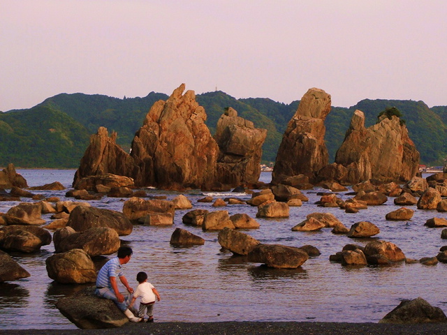 入浴を諦め夕暮れ時の橋杭岩へ。