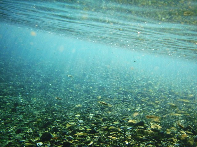水の沸く箇所では透明度が更にUP!空から光が降ってくる。