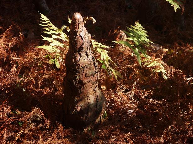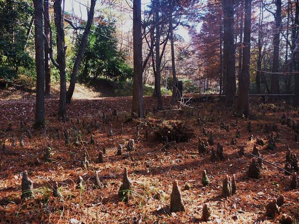 湿地帯に生える杉の一種で、根っこの一部が空気を吸うために地表に突き出るようです。