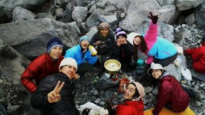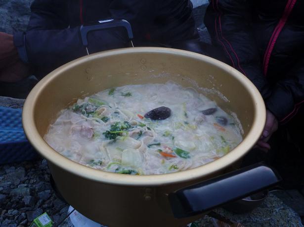 北穂の頂上で知り合ったパーティーにに誘われ豆乳鍋や焼酎をいただく。
