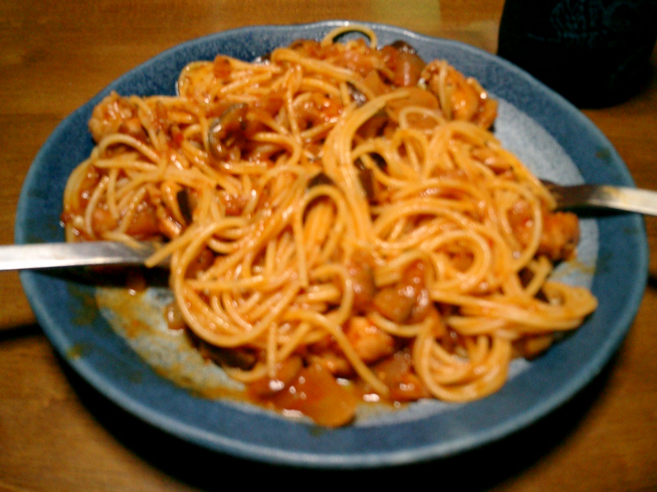 レトルトのミートソースにニンニク玉ねぎバジル鶏肉ナスにケチャップとんかつソース。
