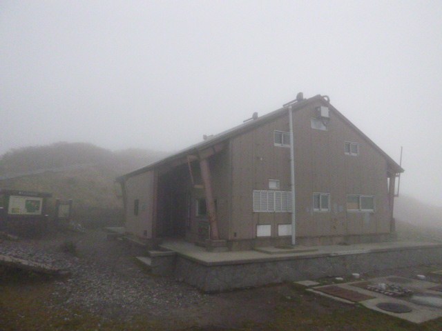晴れの予報に反し、強烈なガスと風。こんな日には小屋の存在が助かる。